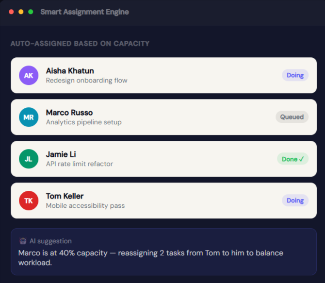 Skill-matching: assigns based on past delivery patterns tracked by team disquantified org