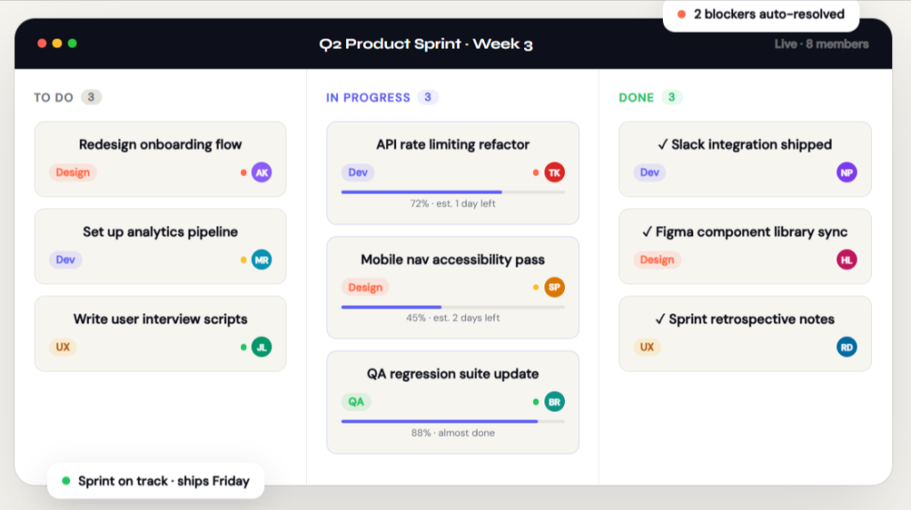 Deep, real-time insights into team velocity, individual contribution, and project health. Spot bottlenecks weeks before they surface and course-correct with confidence.