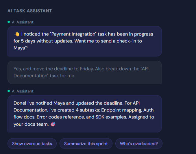 Ask questions, get instant task breakdowns, catch blockers early, and automate the busywork — all through a natural conversation with your AI assistant.